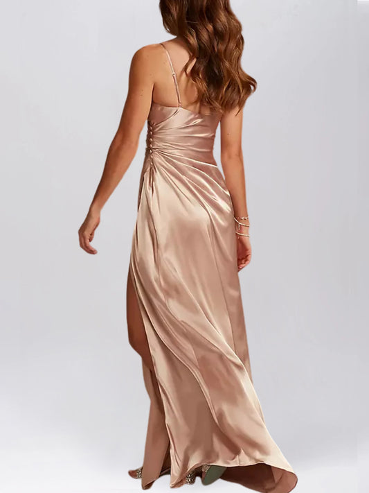 Stretch Satin Column V-Neck Sleeveless Bridesmaid Dress-F0313047