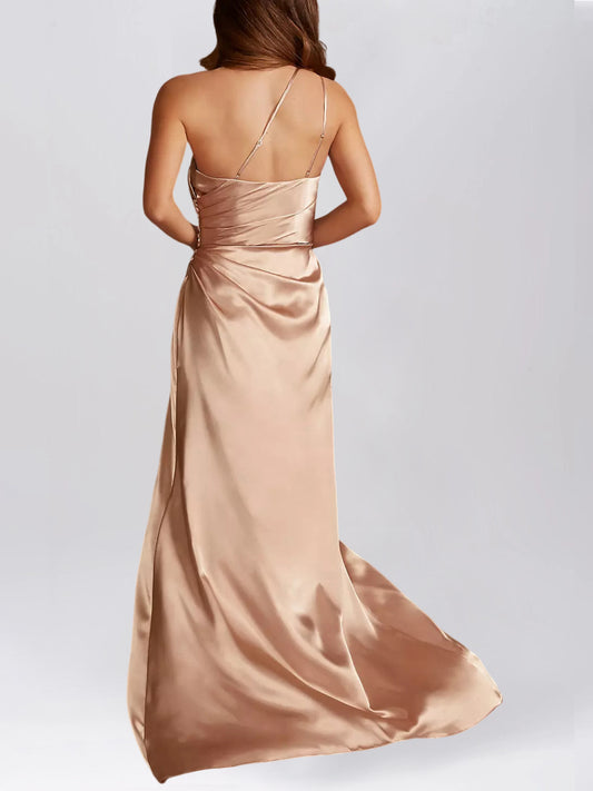 Stretch Satin Column One Shoulder Sleeveless Bridesmaid Dress-F0313045