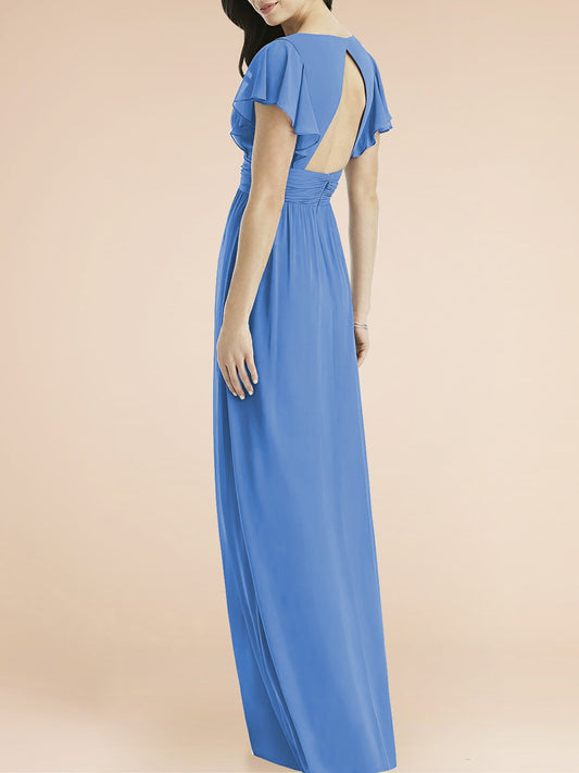 Chiffon Column V-Neck Lotus Leaf Sleeves Bridesmaid Dress-F0113295