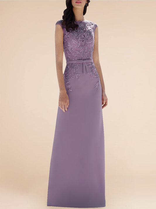 Lace Column Boat Neck Cap Sleeves Bridesmaid Dress-F0113396