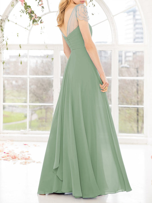 Chiffon Column V-Neck Cap Sleeves Bridesmaid Dress-F0311125