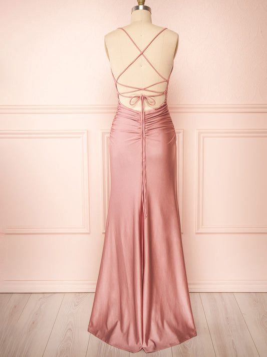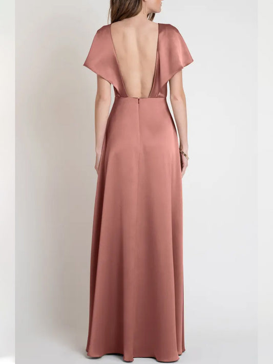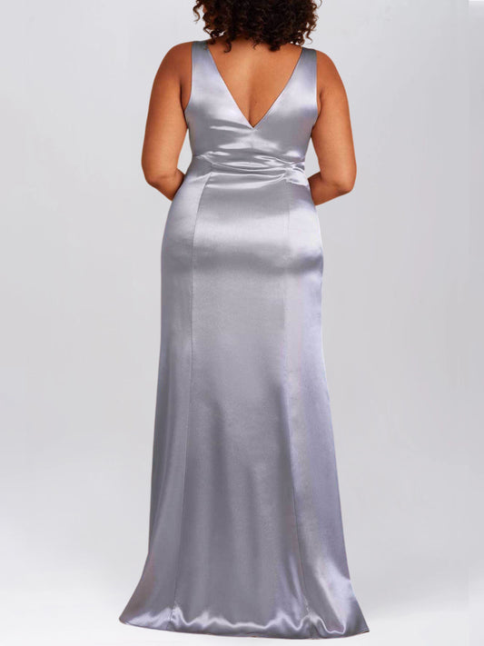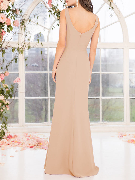 Stretch Satin Column V-Neck Sleeveless Bridesmaid Dress-F0313052
