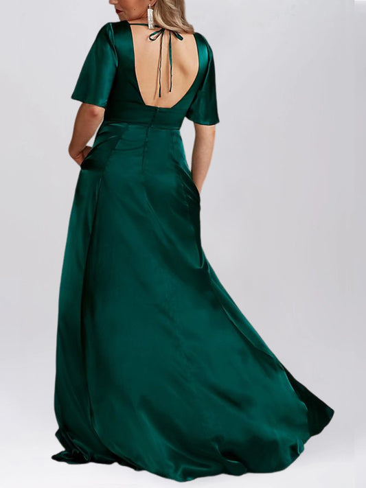 Stretch Satin A-Line V-Neck Half Sleeves Bridesmaid Dress-F0313050
