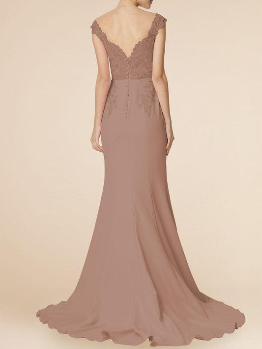 Lace Column Boat Neck Cap Sleeves Bridesmaid Dress-F0311015