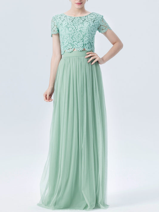 Lace Column Boat Neck Short Sleeves Bridesmaid Dress-F0113007
