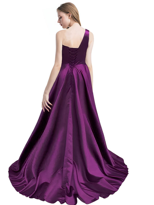A Line Long Prom Dress One Shoulder Satin Slit Evening Ball Gown GD101506