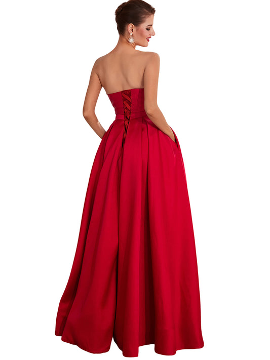 A Line Long Prom Dress Strapless Satin Slit Evening Ball Gown GD101542