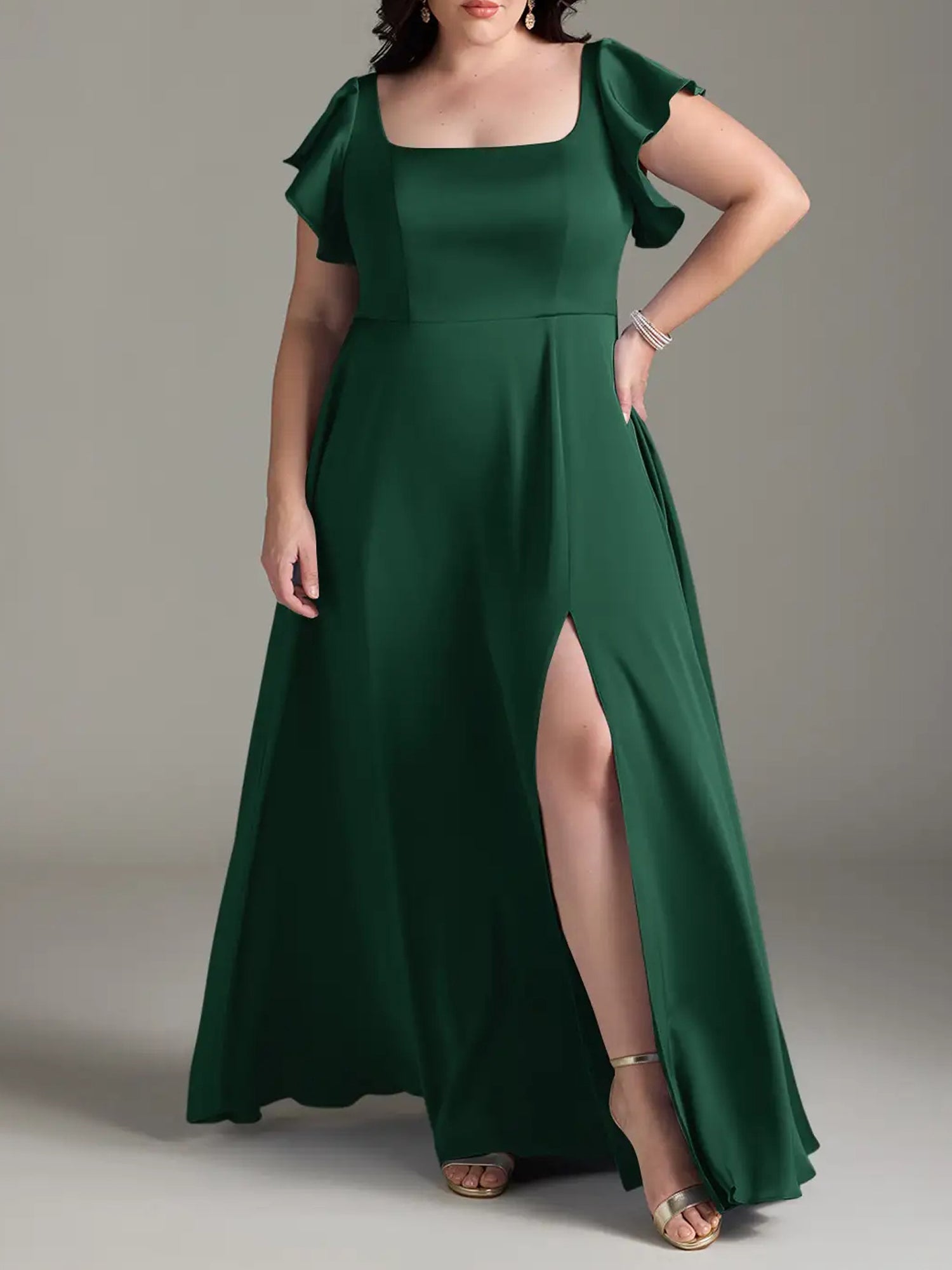 Dark Green Chiffon A-Line Square Neck Dress-F0114001